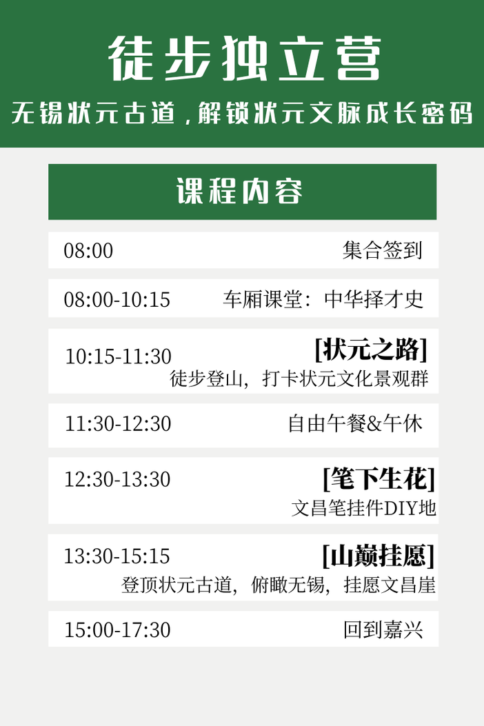 02:在古道中途的休憩点,我们将开展一场生动有趣的“状元文化小课堂”。老师会带着孩子们梳理“状元族谱”,讲述四位状元的求学故事与励志经历,解读“一榜九进士”“六科三解元”的无锡科举佳话 。