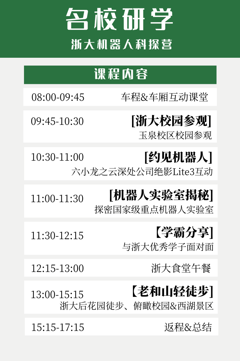 这一次我们将:走进浙大玉泉校区,探访名校;听专业人士讲解杭州六小龙之一的“云深处科技公司”发展历史,与绝影Lite 3机器狗亲密互动;走进祖国的科技之光——走进浙大最顶尖机器人实验室;聆听浙大学霸分享奋斗历程和成长故事;体验浙大食堂中餐,徒步浙大依背的老和山,俯瞰浙大校园及西湖景区。